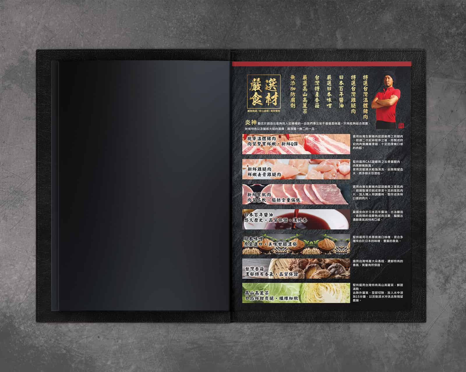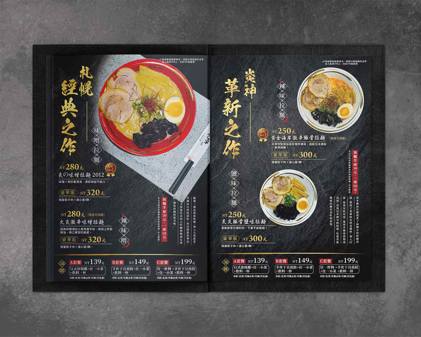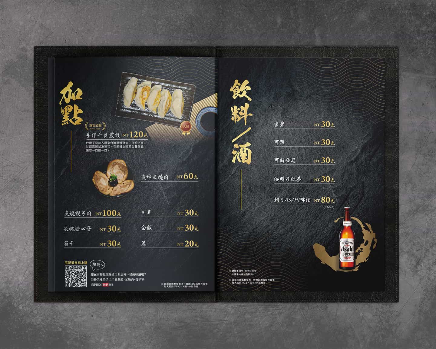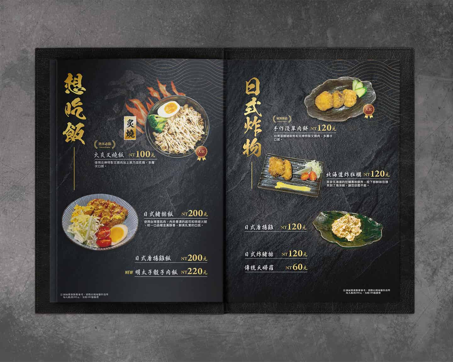 這次菜單本呼應LOGO字體的剛硬勁道,使用特殊紙材包封外殼,讓表面紋理乍看像是岩石一般,再運用彩噴工法噴上LOGO,提升整體質感,內頁著重在食物照片上,每一頁的金色毛筆標題映襯在黑色紋理上格外醒目。